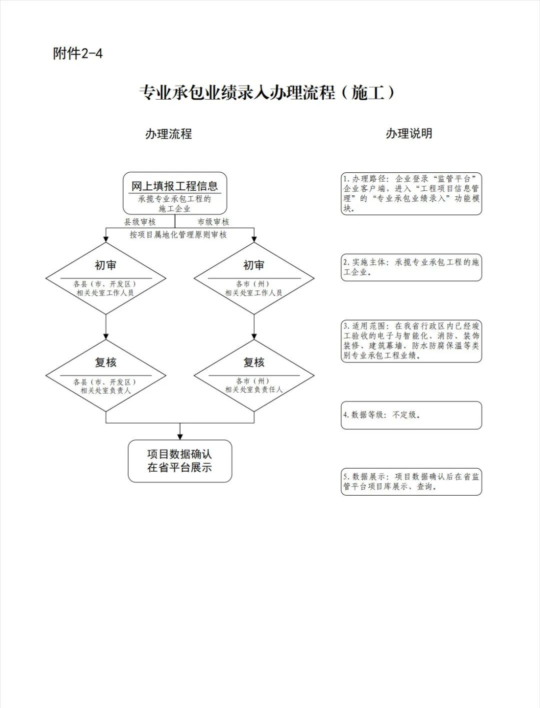 3.办理流程。企业登录“省监管平台”企业客户端,进入“工程项目信息管理”的“专业承包业绩录入”功能模块,填写项目信息采集表并上传对应附件材料后,报由项目所在地县(市、开发区)、市(州)住建主管部门审核确认。